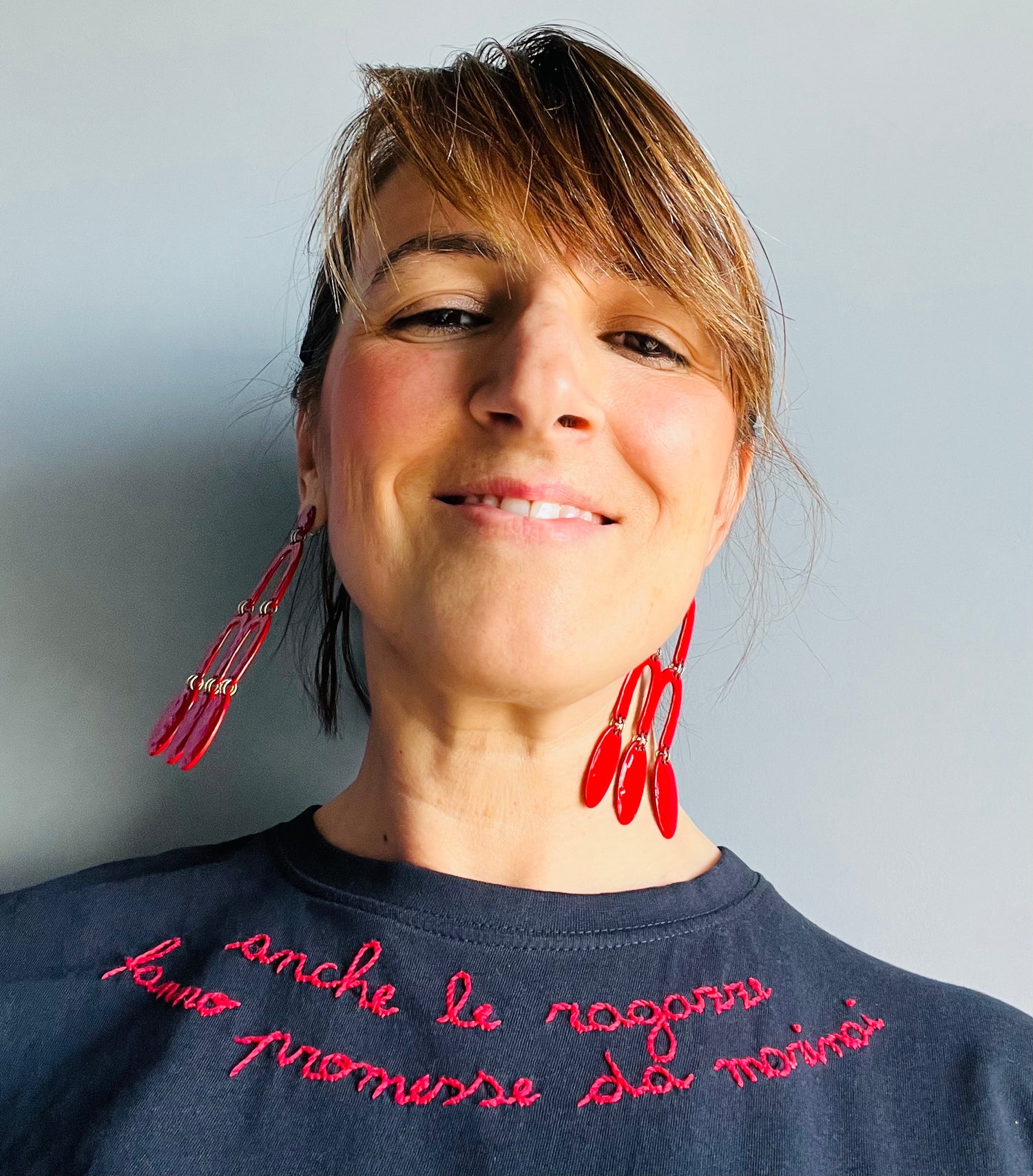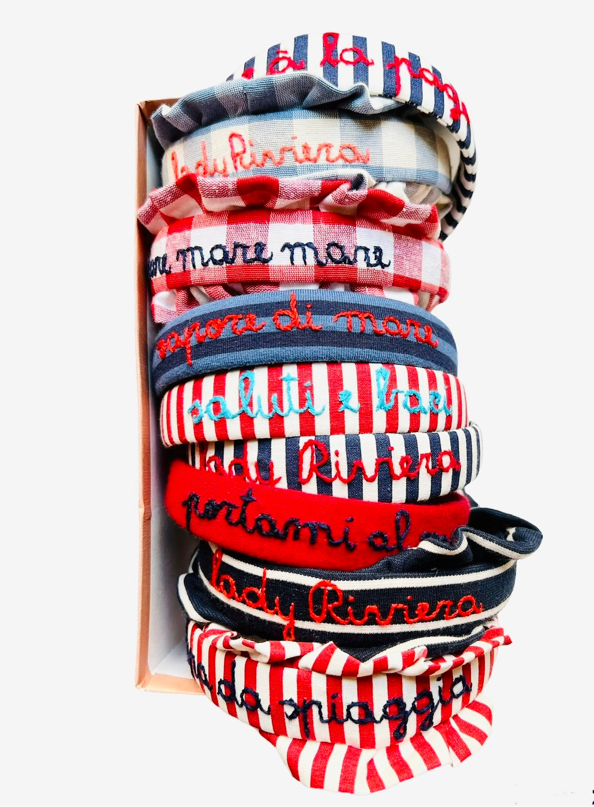 Collane di parole si posano sul blu navy, bianco oppure le righe delle nostre t-shirts best sellers. Talvolta ricamate a mano anche sul retro, l'effetto sorpresa e' garantito!