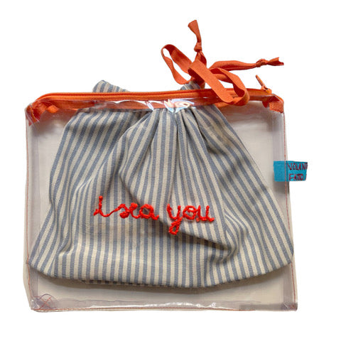 Bustina in pvc ricamato a mano " i sea you" con sacchetto estraibile in cotone a righe azzurre