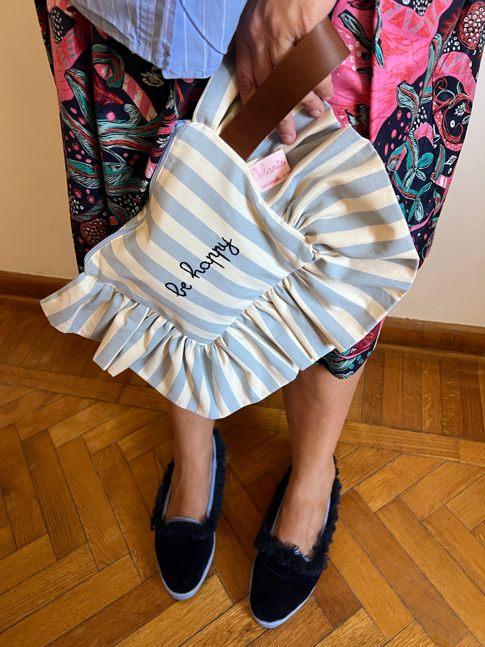 pochette a righe celeste carta da zucchero "be happy" ricamata a mano