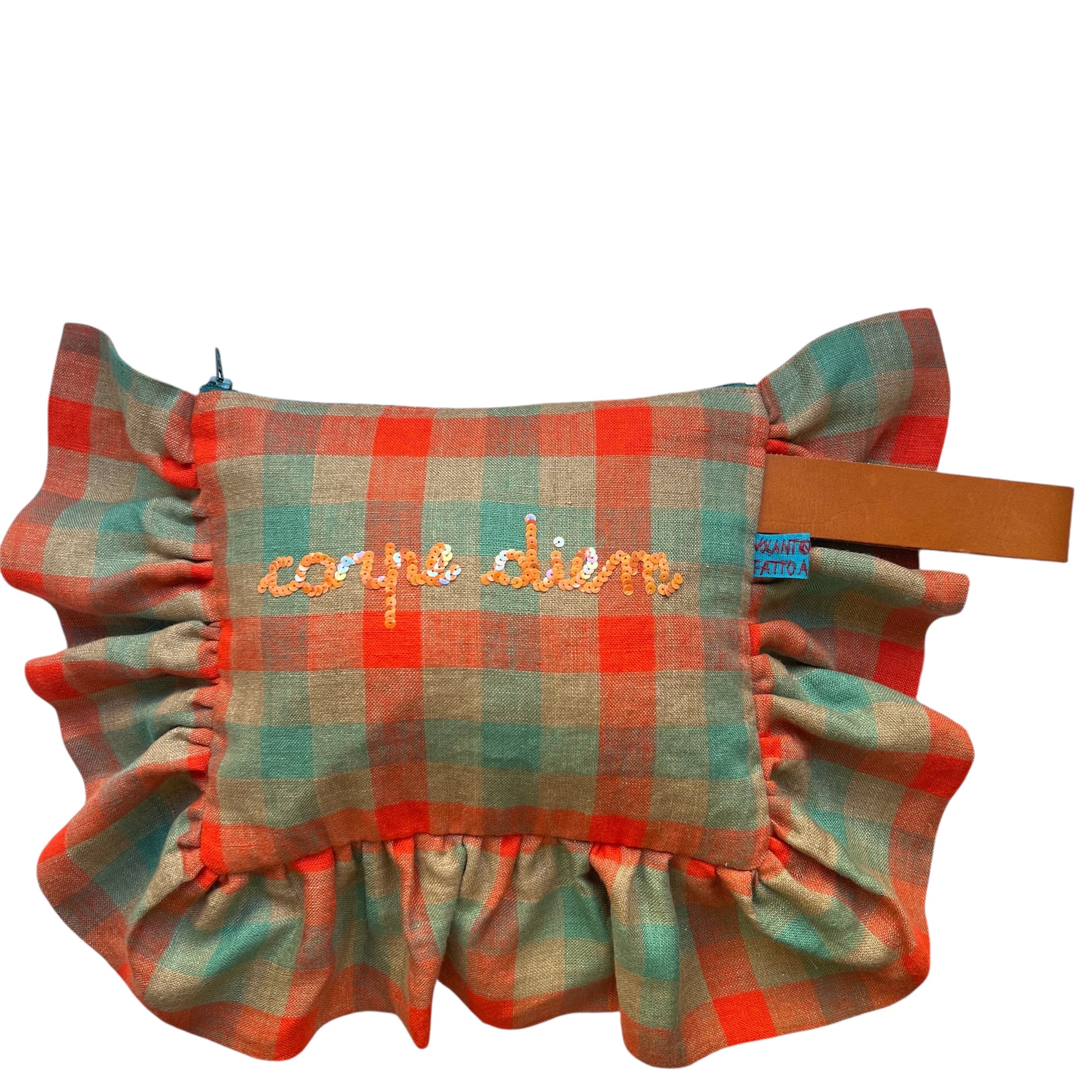 Pochette in puro lino check turchese e corallo “carpe diem” ricamata a mano con paillettes. Ogni paillettes e’ applicata una ad una !
